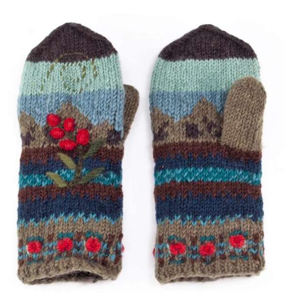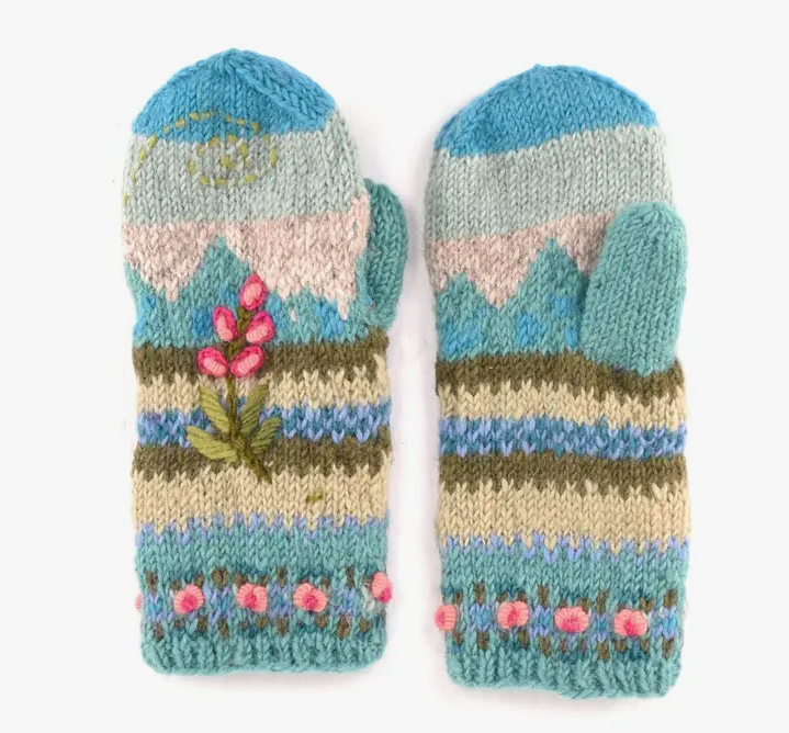 These mittens resemble an alpine meadow alive with wildflowers. A cute hand-stitched spiral has been added for interest. Classic in shape and with a secure cuff and full fleece lining for practicality.