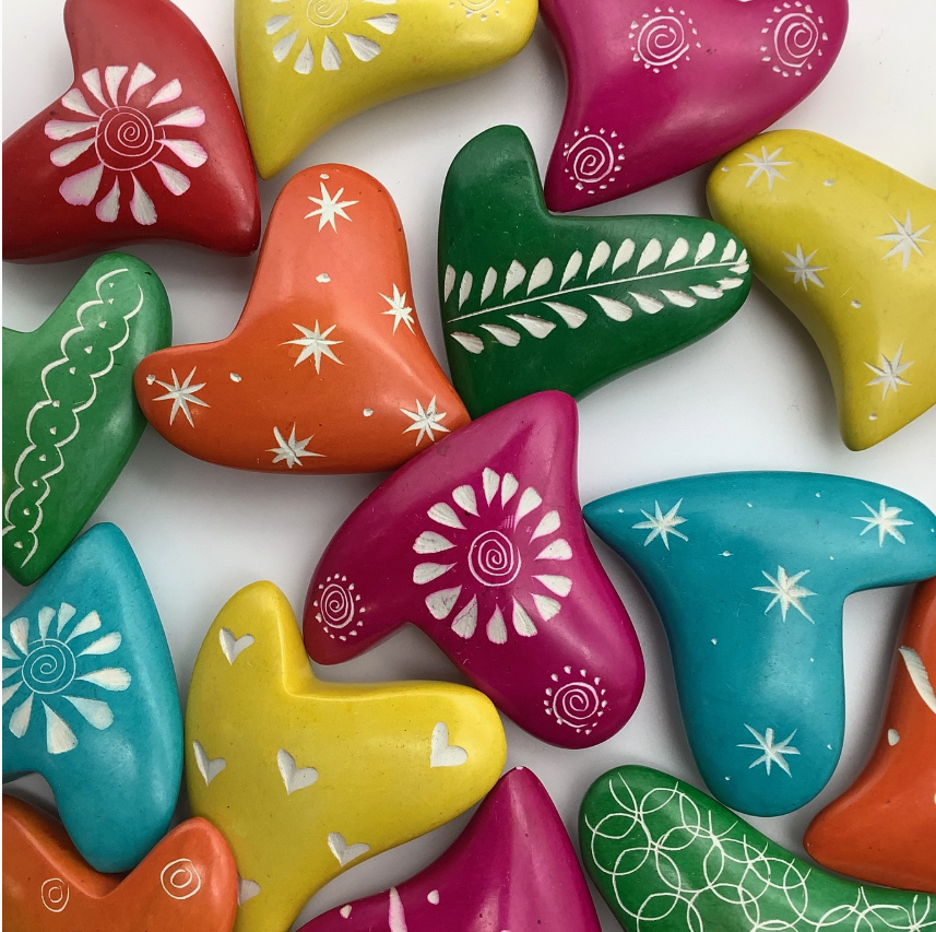 Add a playful touch to any space with these Fair Trade funky soapstone hearts, hand-carved by artisans in Kisii, Kenya. Bold and whimsical, each heart is a unique, artistic piece that showcases the rich soapstone carving traditions of Kisii. Crafted from soft soapstone, these vibrant hearts are perfect for anyone who loves distinctive and creative decor.