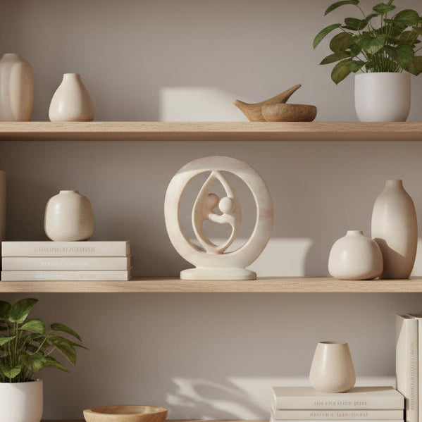 Hand-carved from a single piece of Kisii soapstone by artisans in Kenya, this contemporary sculpture features a representation of two lovers in a circle, each with one arm soaring overhead while their bodies form a heart.