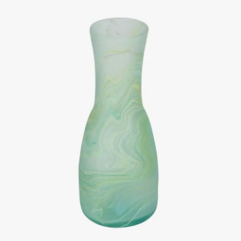 Blowing Phoenician glass is a tradition passed down, often within families, with secret recipes that are held tight. Skilled artisans smash recycled bottles into pieces, melt in high temperature ovens then roll and blow these sculptural carafes. Each one of these is unique and so highly prized in West Bank, they are often reserved as wedding gifts.