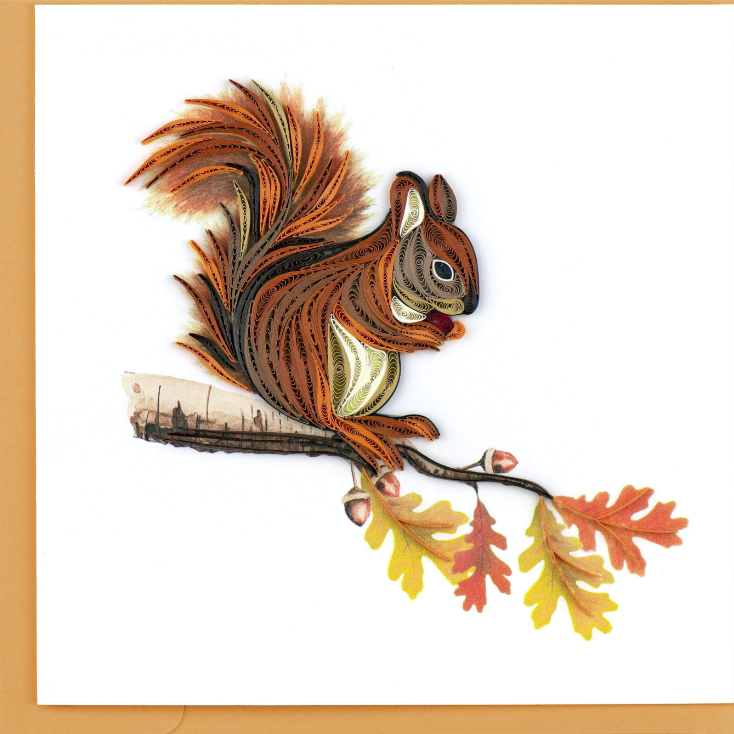 Share a quilled Squirrel greeting card with your nuttiest friend! Squirrels are commonly seen collecting acorns in the fall for the winter and symbolize energy and socialization. The design features a quilled squirrel in shades of brown and orange with a large fluffy tail as he nibbles on an acorn while perched on a tree branch with autumn leaves.